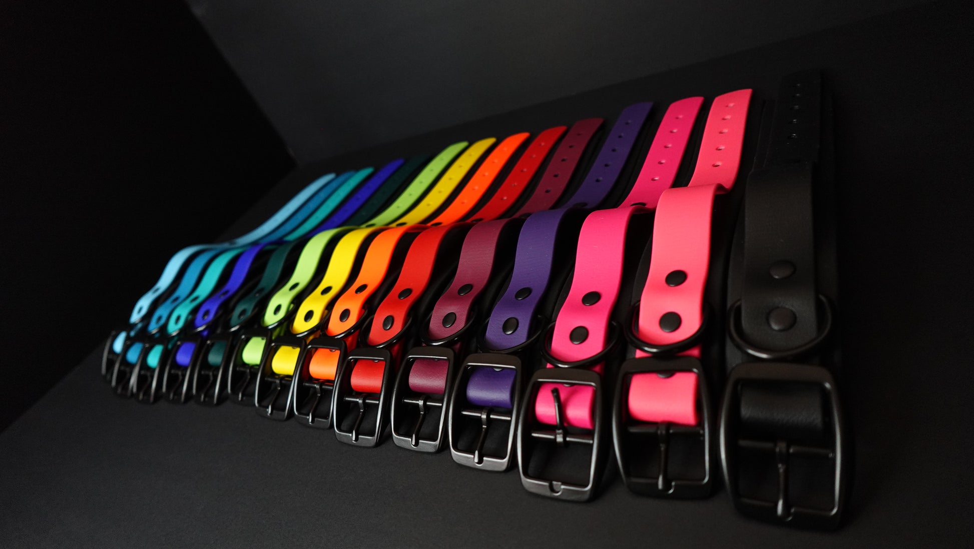Our cuffs are made of biothane and use metal hardware. Biothane is durable, low maintenance, waterproof, and odor resistant, making it an ideal material for gear. As a synthetic material, it serves as a vegan alternative to leather available in a wide range of colors not normally available in leather.